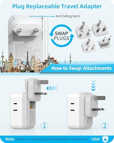 – **Detachable Plug System:** This adapter kit comes with interchangeable Type G, C, M, and D plugs, making it easy to adapt to different regions. Simply swap the plug based on your destination for hassle-free charging.